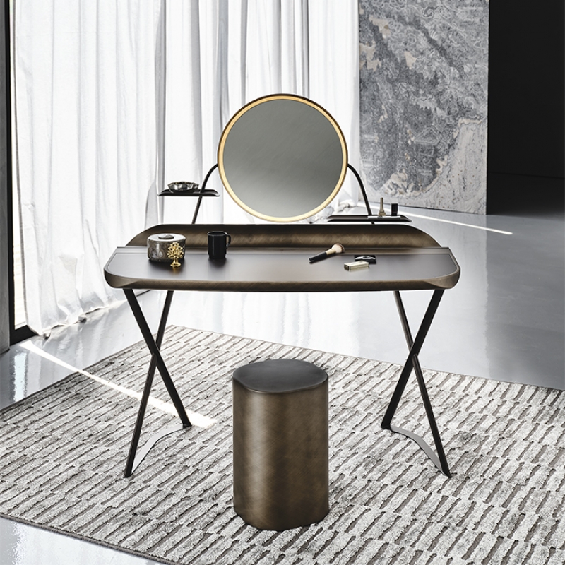 Coordinated and complementary in design and versatility, the Cocoon collection is designed by Paolo Cattelan and is smart and multifunctional. Their compact volume allow these console tables to be used as home office stations, as dressing tables, or as reading corners, and to be placed in small areas of the home. With their rounded lower profile and grooved tray they can be used as entryway tables as well. The makeup console comes equipped with a mirror, LED light, side supports and shelves in the same colour. The exclusive Brushed Grey and Brushed Bronze finishes give a truly magical touch. The top is available in several refined Marmi ceramic nuances or in many leather colours.
