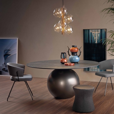 Circus is a fixed table which draws on the laws of physics for its contrast of quite different geometric shapes: the impressive and scenic central base is surmounted by a large disc-shaped top, evoking a pleasant sensation of movement. The table acquires strength and elegance in a unique balancing act, becoming the real protagonist of the living area. The top is available in solid wood, ceramic or marble, and it adapts perfectly to the style of the house, blending harmoniously with the environment without, however, losing its uniqueness. The metal base is available in different versions, including the elegant pearl gold, platinum and clouded chrome finishes.