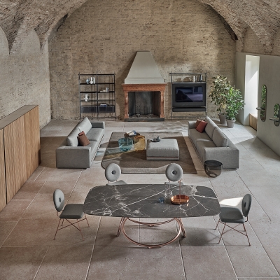 The Bontempi Casa Louis Barrel Table is an elegant and majestic piece with a sculptural presence. Its ethereal base, consisting of oval rings, contrasts beautifully with the horizontality of the top. This creates a singular play of perspectives and impeccable balance of shapes. The table comes in fixed or extendible versions, with a barrel-shaped top or rectangular design. You can choose from various materials for the top, including SuperCeramic, SuperMarble, glass, veneer, solid wood, and velvet matt anti-scratch glass.