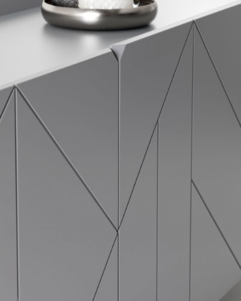Wooden sideboard with hinged doors, inside clear glass shelf, side panels and doors in lacquered decorated wood.