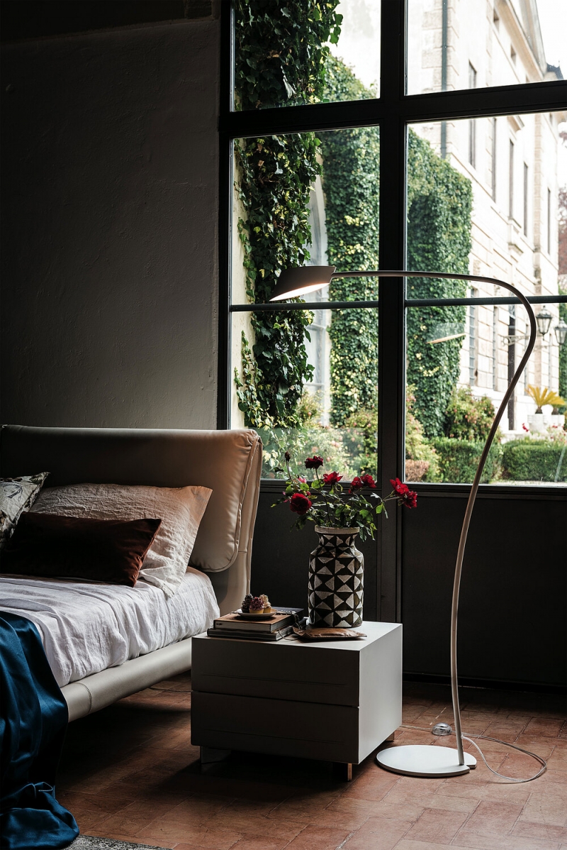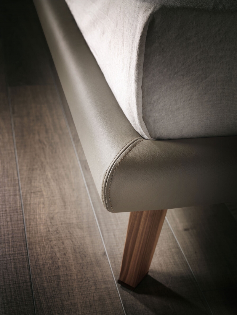 A stylish and comfortable model, the Adam upholstered bed is covered in an extensive and elegant colour palette. The profile outlining the soft headboard can either match the covering or create a contrasting colourful effect, enhancing the silhouette of this modern double bed. Adam boasts a spacious and comfortable headboard, consisting of two large curved cushions and distinct wooden feet in Canaletto walnut or burnt oak.