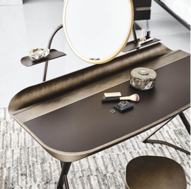 Coordinated and complementary in design and versatility, the Cocoon collection is designed by Paolo Cattelan and is smart and multifunctional. Their compact volume allow these console tables to be used as home office stations, as dressing tables, or as reading corners, and to be placed in small areas of the home. With their rounded lower profile and grooved tray they can be used as entryway tables as well. The makeup console comes equipped with a mirror, LED light, side supports and shelves in the same colour. The exclusive Brushed Grey and Brushed Bronze finishes give a truly magical touch. The top is available in several refined Marmi ceramic nuances or in many leather colours.