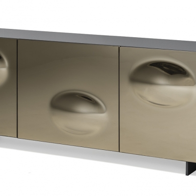 Paramount is a modern design piece conceived by Andrea Lucatello. The doors, made of convex mirrored glass and using skillful manufacturing techniques give volume and rhythm to the structure. Available in a wide range of lacquered gloss or matt colours. Internal clear glass shelves.