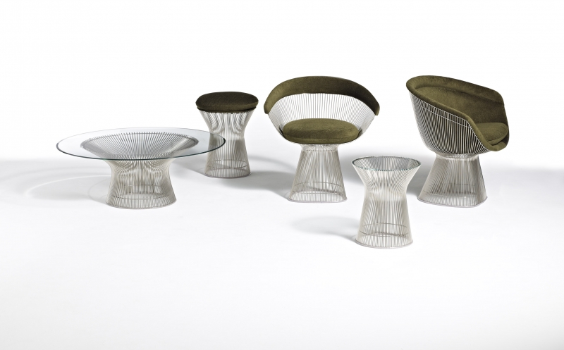 The iconic coffee table, which creates a focal point in any modern living room, is created by welding hundreds of curved steel rods to circular frames, simultaneously serving as structure and ornament. With a choice of glass, marble or wood top.