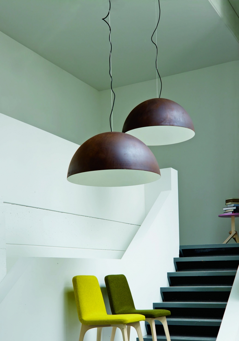 The name of this suspended light evokes the shape and colour of its half-spherical shade. There are 3 shade colours: Artistically rusted, then waxed, with a white lacquered interior, white version, the exterior and interior of which are finished in satin white lacquer and the blue version with bluish patinated steel; interior in satin-finished white lacquer.