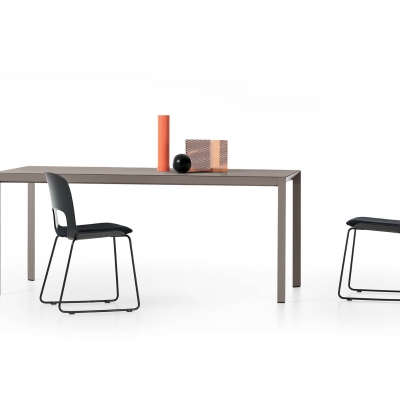 Light, essential, smart: Soffio shapes with a subtle touch adn clever versatility. Its frame, made from aluminium paintes in any of the collection’s 20 colours, features well-designed minimal volumes. Triangular-section legs form corners with a diamond-like sharpness to them and support the top in wood matt lacquered finish. It comes in 5 widths, while lengths can be made to order.
