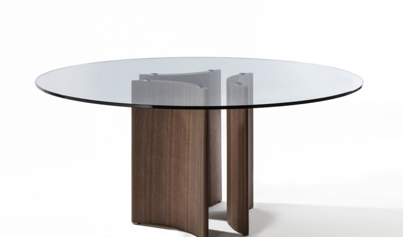 Dining table with base made up of half-moon single elements in canaletta walnut and top in transparent glass (thickness 15 mm), in wood (thickness 40 mm), in marble (thickness 20 mm) or in Rock (thickness 6 mm). Metal endfeet in black chrome finish.
