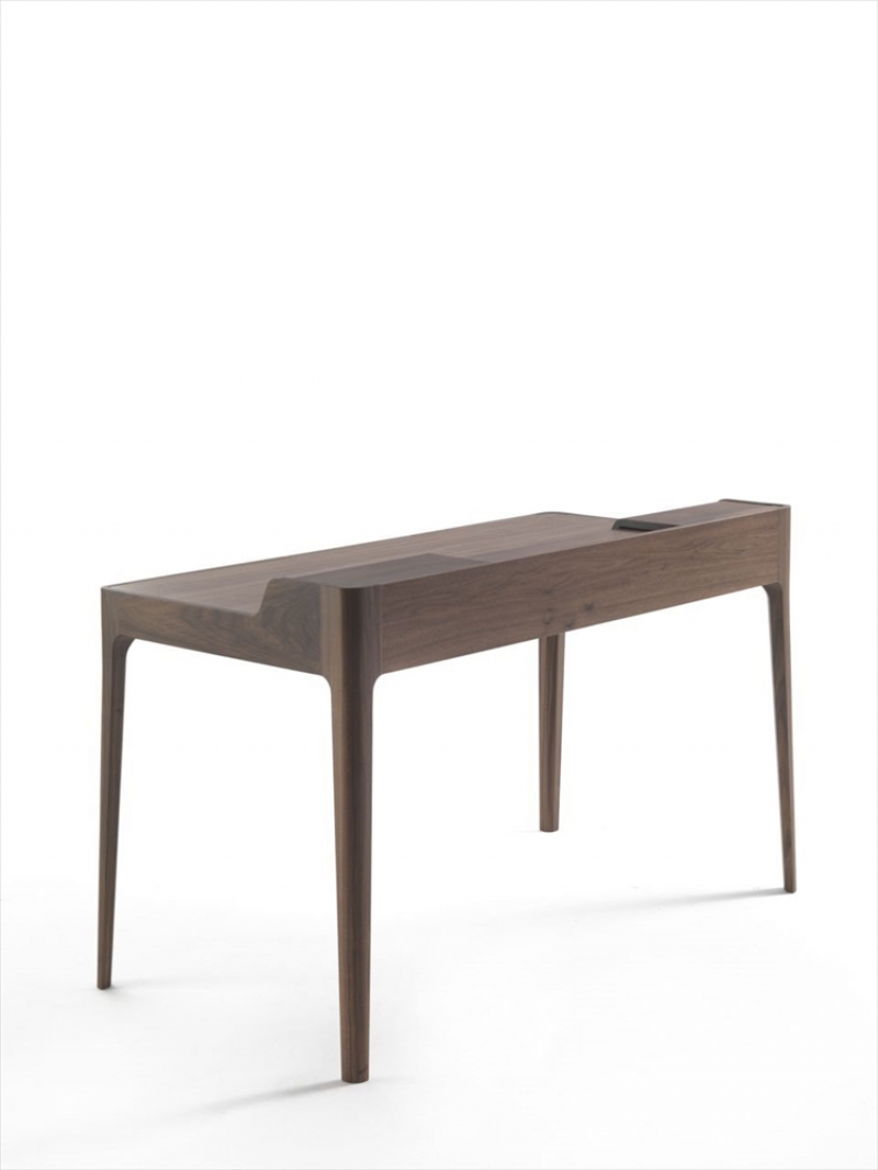 Saffo is a designer writing desk from the creative mind of Carlo Ballabio for Porada featuring a drawer in solid canaletta walnut, compartments and totally hidden cable management. Desk pad in cuoietto.