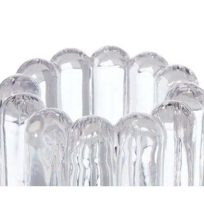Press is a medium-sized vase, designed and engineered to catch and refract light, and to last for ever. This heavyweight grooved vase is made of fat, chunky coils of pure and clear transparent glass. Bold in silhouette and simple in function, it is manufactured by dropping big globs of molten glass at 1,200 degrees centigrade and pressed in two or three part iron moulds to create the immediately familiar silhouette.
